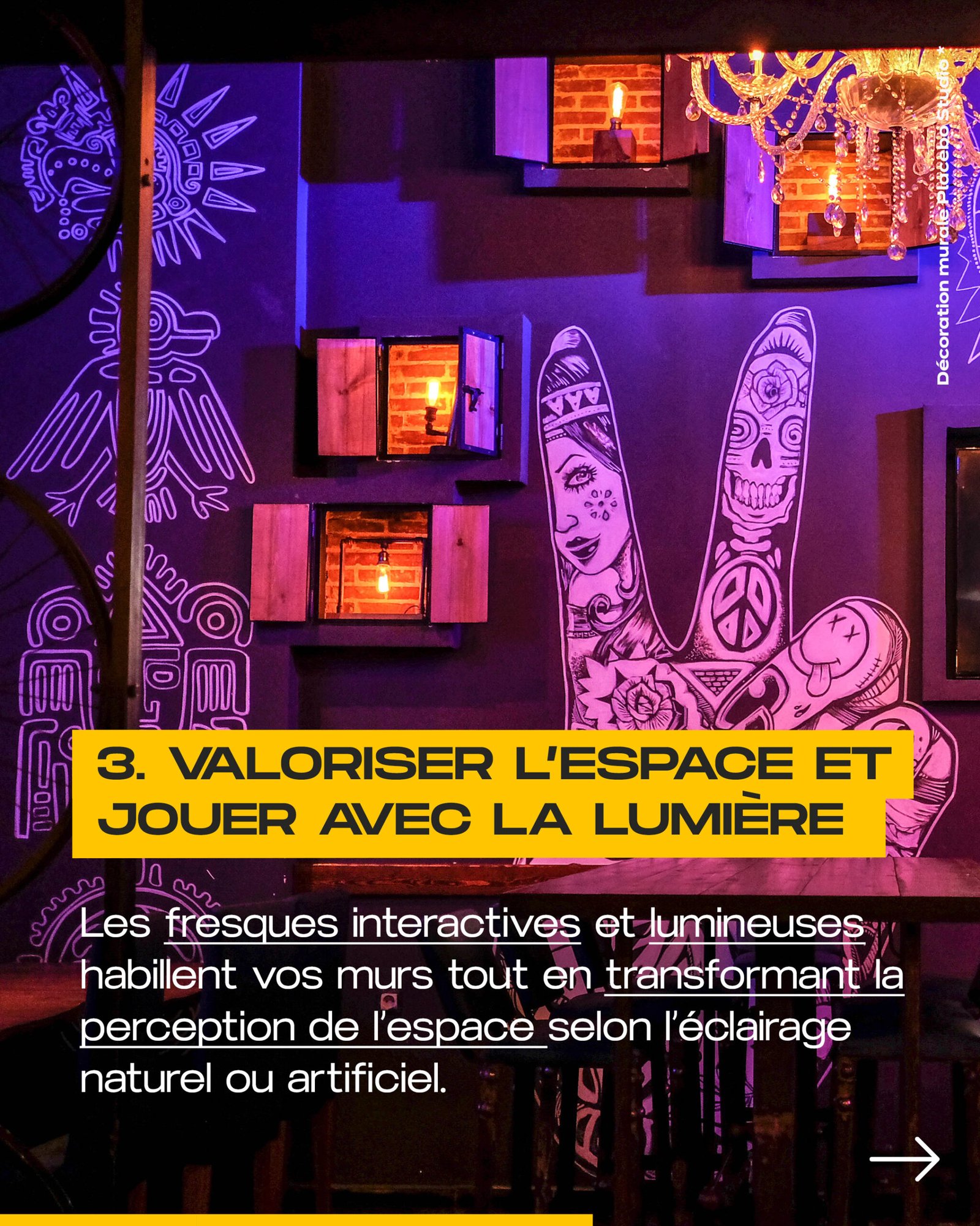 On peut opter pour des fresques peintes à la main, des fresques digitales projetées, ou encore des œuvres interactives intégrant la lumière. Le choix dépend de l’ambiance recherchée et de l’espace disponible.