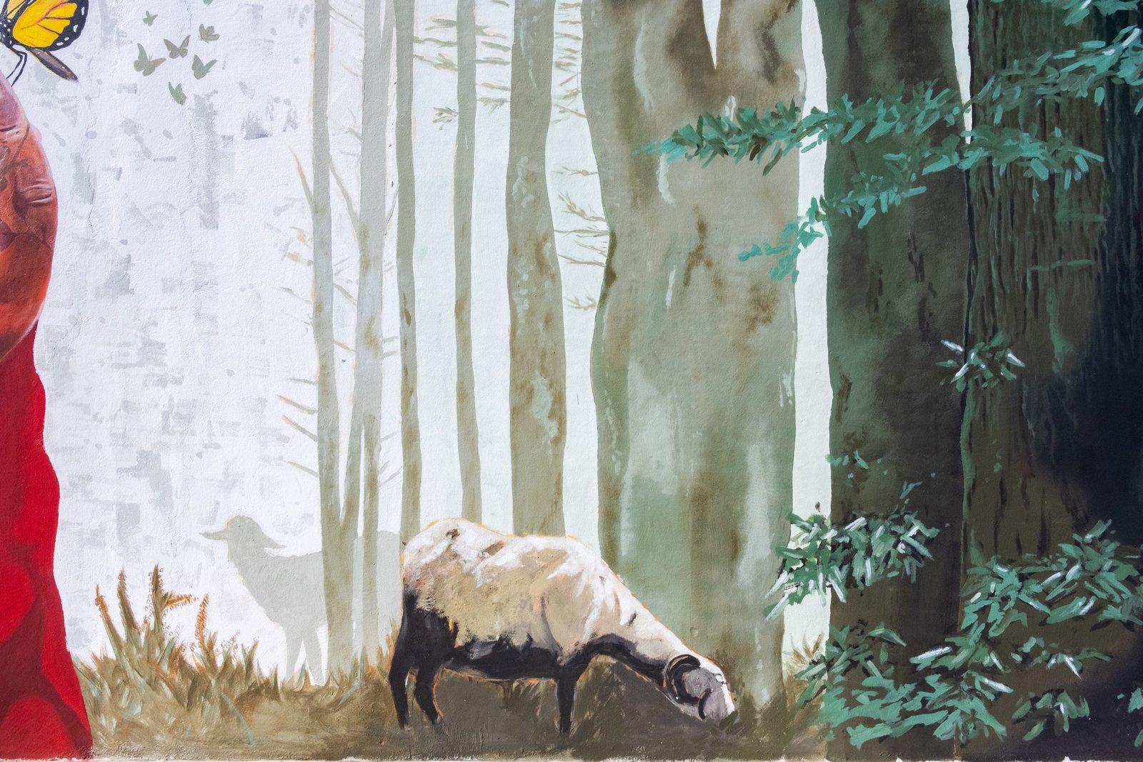 D’autres passants ont suggéré de mettre la couleur orange sur les papillons. Une autre personne nous a interpellé également pour nous suggérer d’ajouter un petit mouton parce que les paysans de la région de Bouskoura font paître leur moutons dans la forêt et donc c’est grâce à cette remarque d’un passant qu’on a décidé de rajouter un mouton à la fresque.