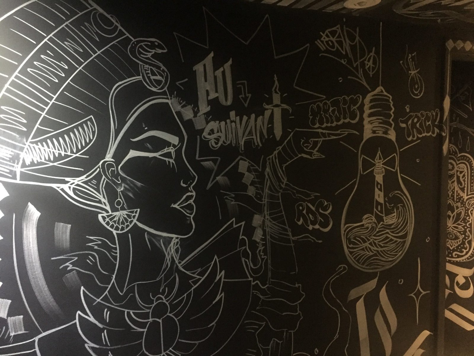 📌 Le défi ? Créer une identité forte et cohérente pour plusieurs lieux, tout en proposant un univers graphique inédit : peindre sur fond noir, presque exclusivement avec du blanc, et y injecter, çà et là, des touches d’or ou de fluo. Un pari radical, et surtout, une réussite.