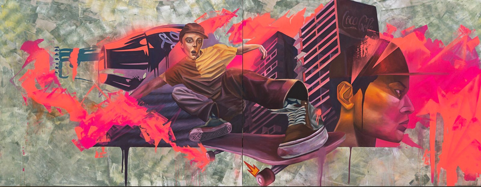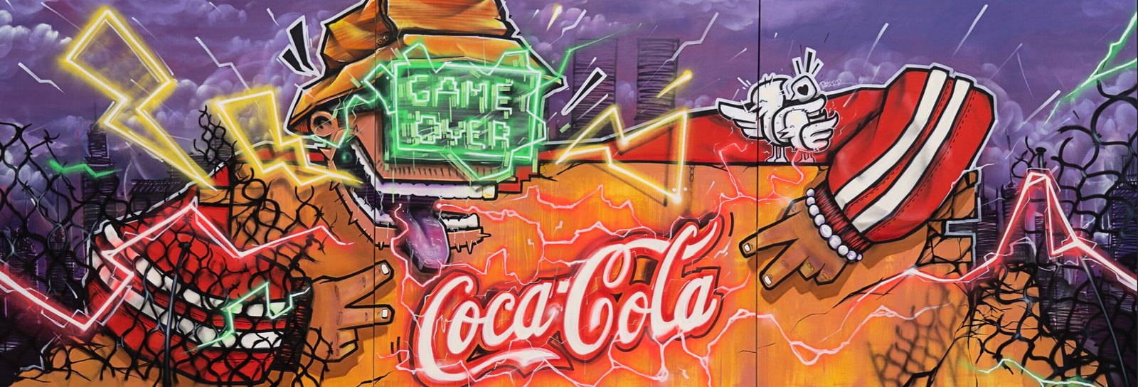 - Sker : une fresque graffiti énergique avec un personnage électrisé enlacé à une bouteille Coca-Cola.