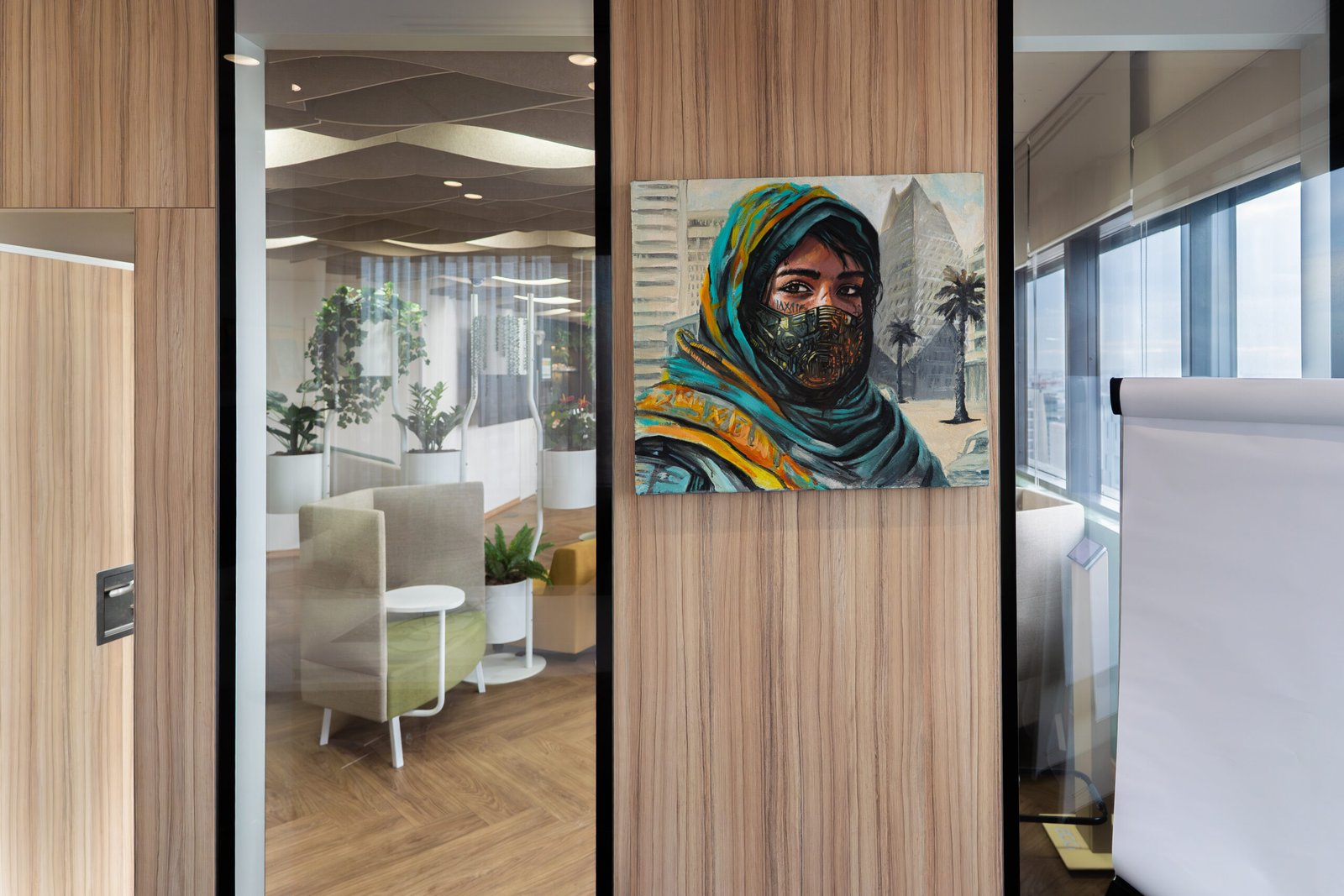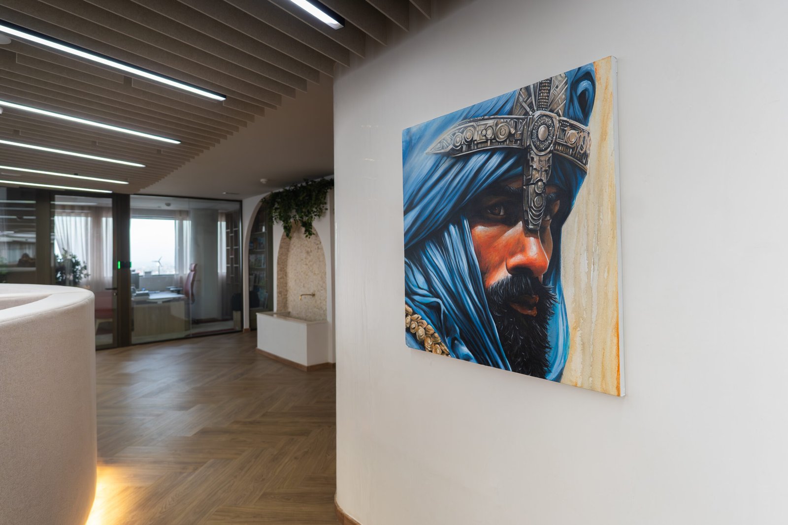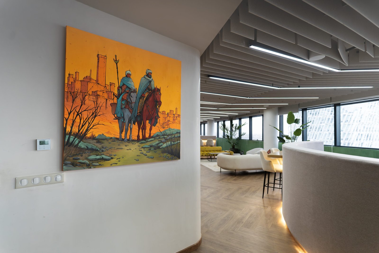 L’un des défis majeurs de ce projet a été le travail sur les formats. Les espaces des bureaux présentaient une grande diversité de configurations, ce qui a nécessité des réponses artistiques entièrement sur mesure, allant de très petits formats conçus pour des niches murales à des tableaux panoramiques et allongés destinés aux couloirs et aux open spaces, ainsi qu’à des œuvres intégrées dans des zones de transition ou de circulation.