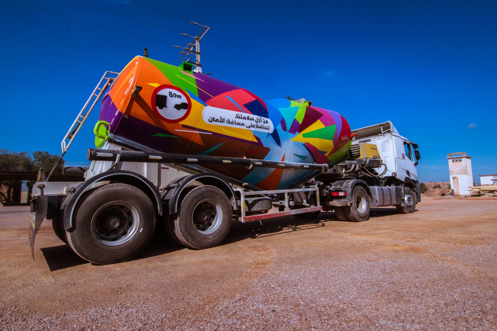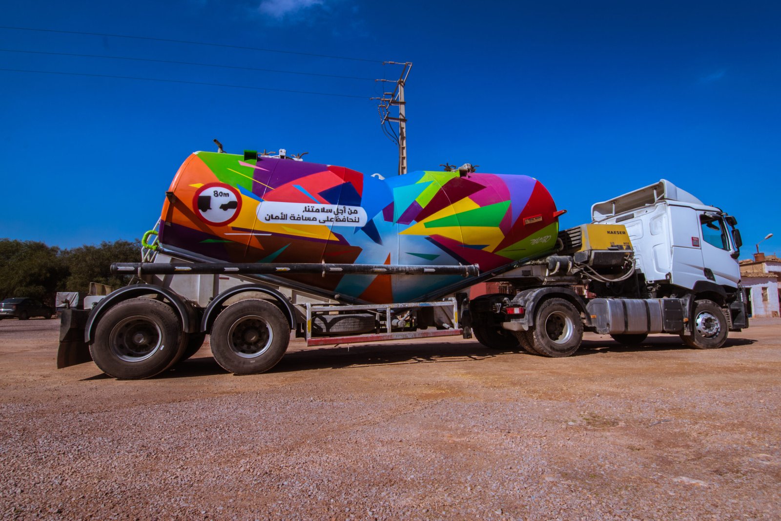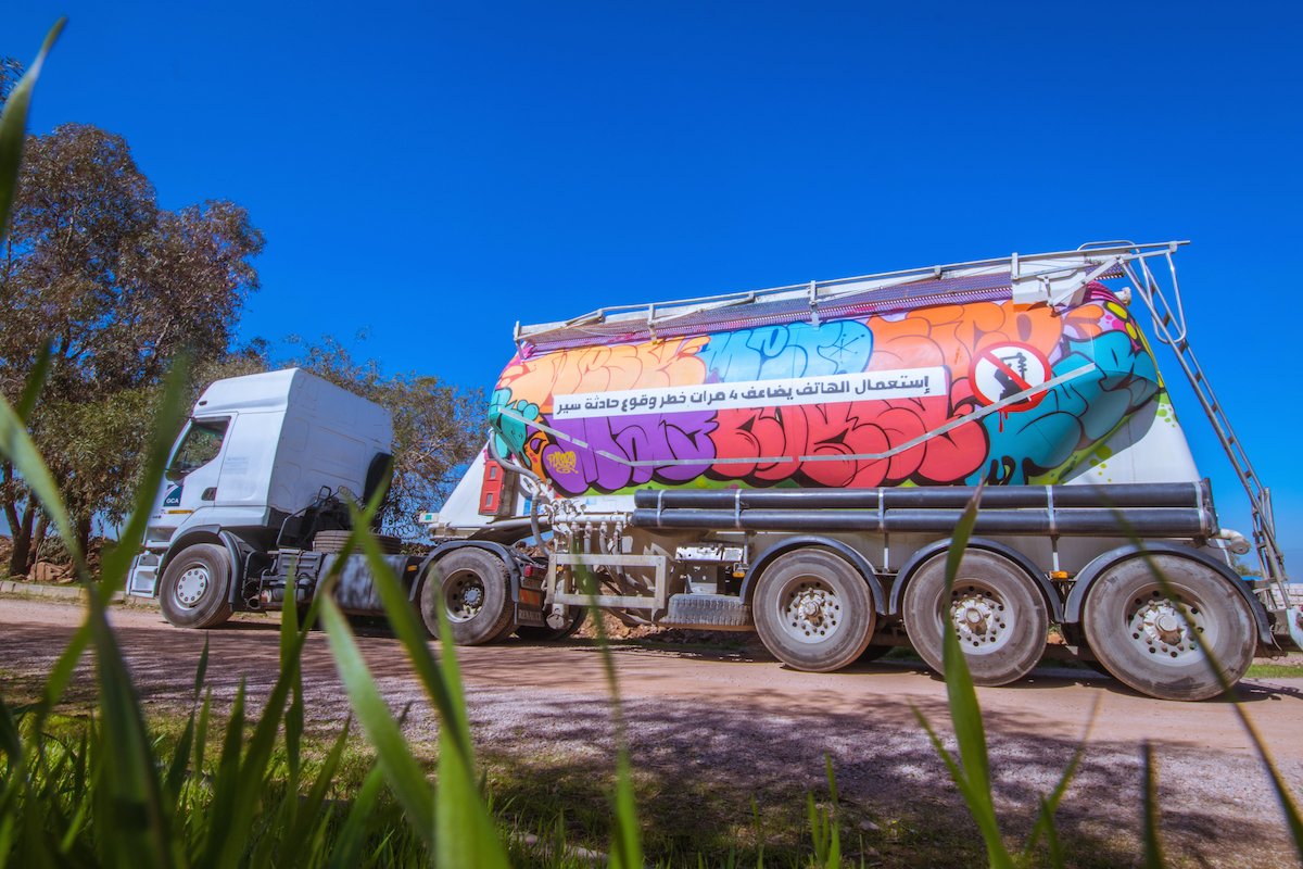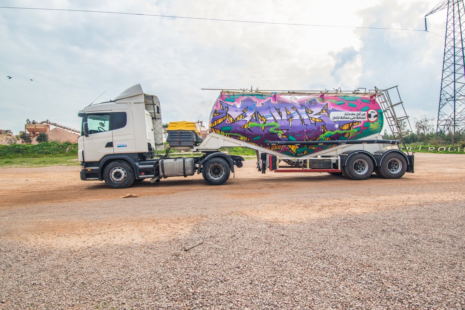 Le brief de Lafarge Maroc était clair : sortir du cadre, littéralement. L’idée était de véhiculer des messages simples mais percutants (“ne téléphonez pas au volant”, “respectez les distances de sécurité”, “attention aux piétons”, etc.) à travers des œuvres de street art peintes à la bombe directement sur les citernes des camions.