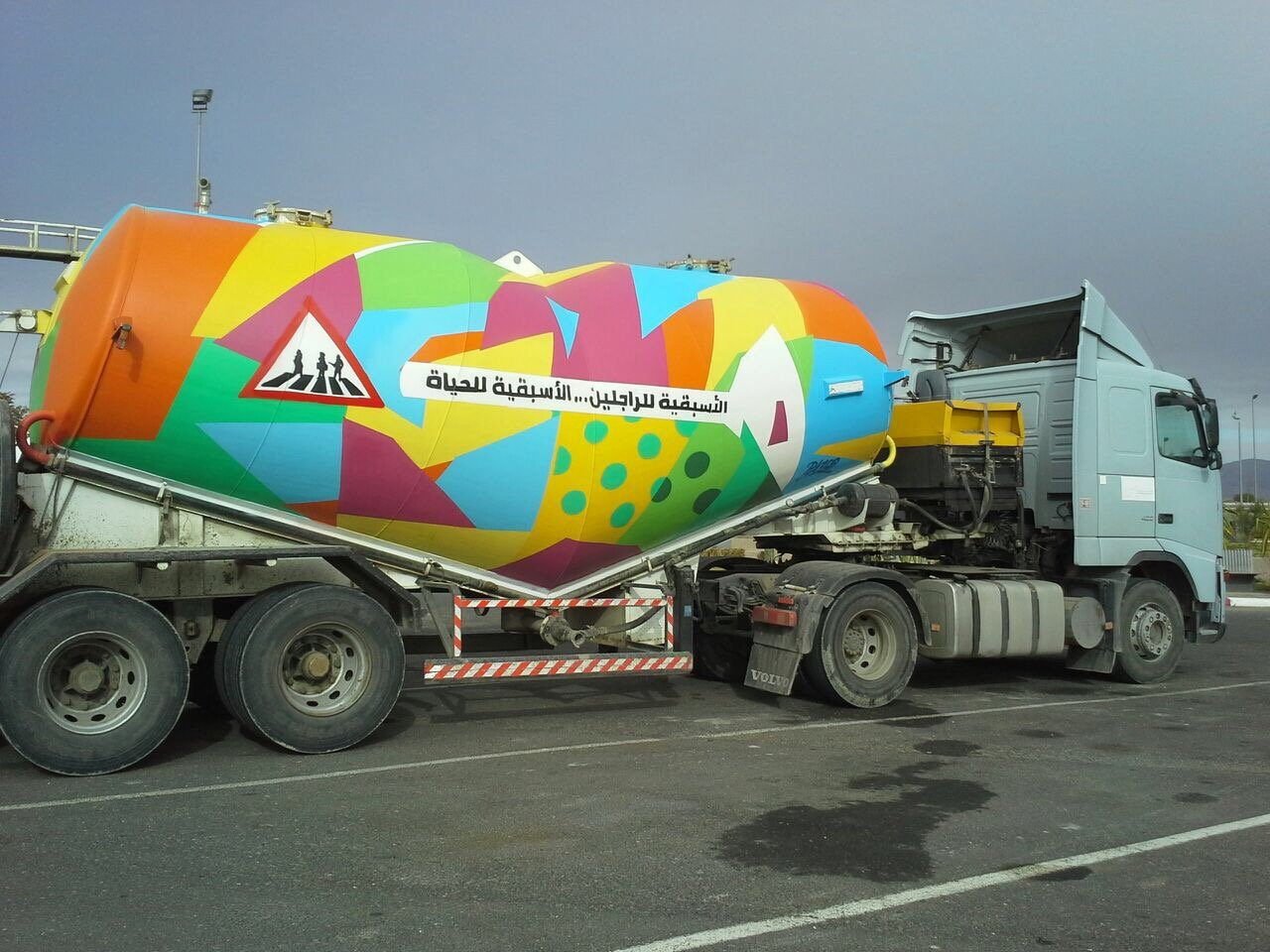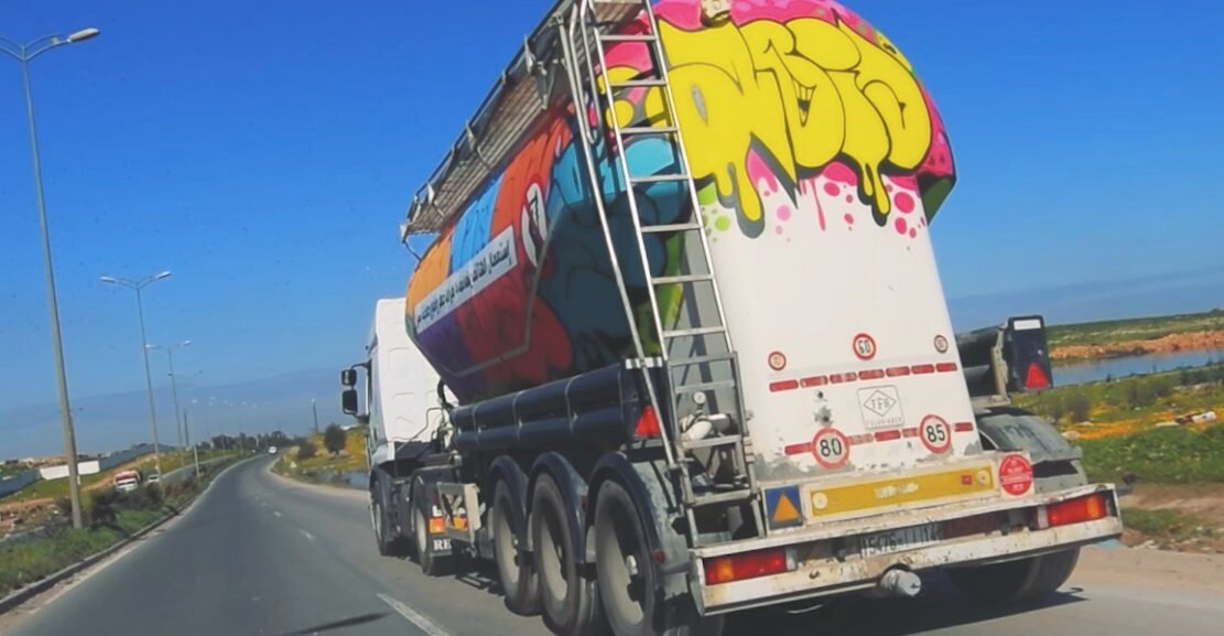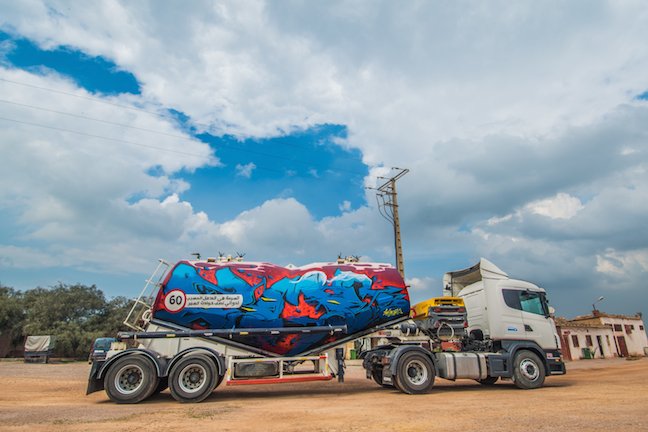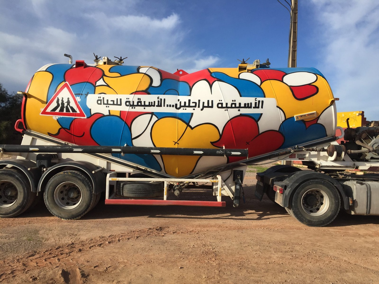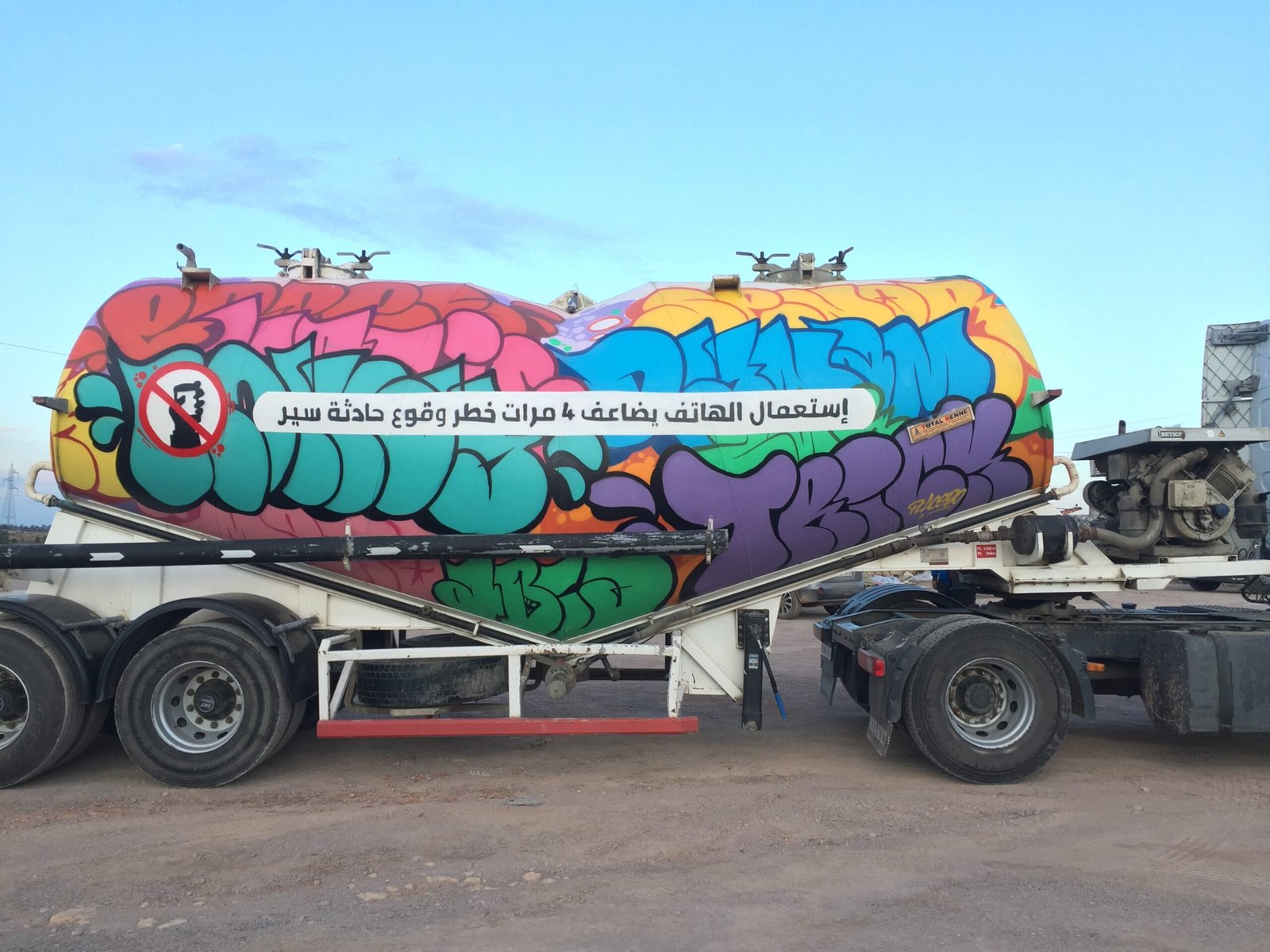 Le brief de Lafarge Maroc était clair : sortir du cadre, littéralement. L’idée était de véhiculer des messages simples mais percutants (“ne téléphonez pas au volant”, “respectez les distances de sécurité”, “attention aux piétons”, etc.) à travers des œuvres de street art peintes à la bombe directement sur les citernes des camions.