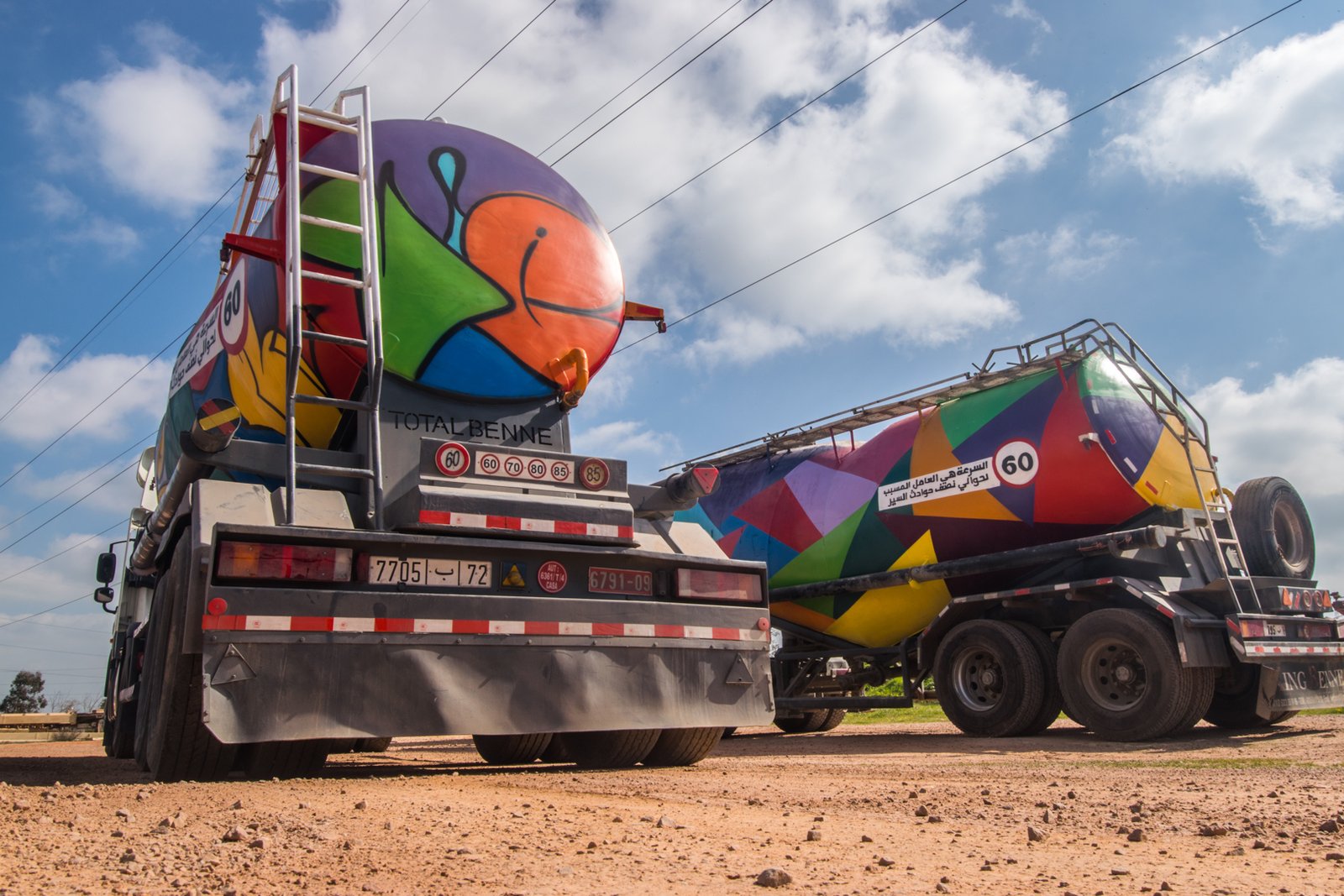 En 2017, notre équipe est sollicitée par Lafarge Maroc pour une mission hors norme : transformer 25 camions-citernes en véritables supports d’art urbain itinérants, dans le cadre d’une campagne nationale de sensibilisation à la sécurité routière.