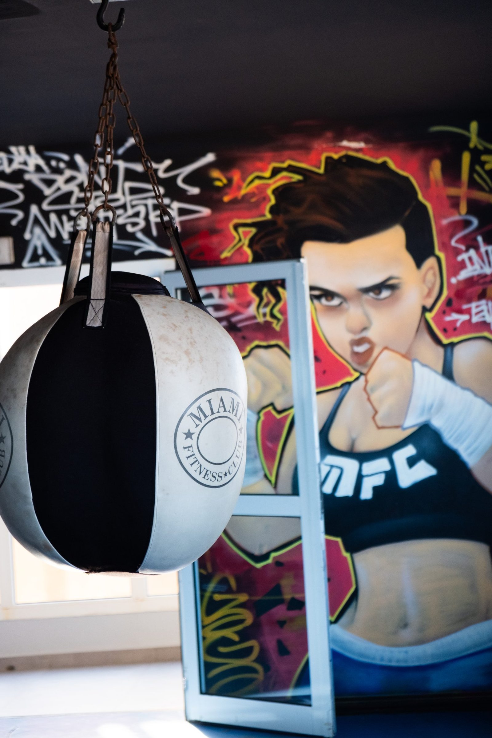 Du couloir d’entrée au ring de boxe, en passant par les sacs de frappe et les plafonds, chaque surface a été exploitée. L’objectif ? Créer une expérience visuelle totale, inspirée de l’univers new-yorkais underground, entre graffitis puissants, figures de combat, et citations inspirantes.