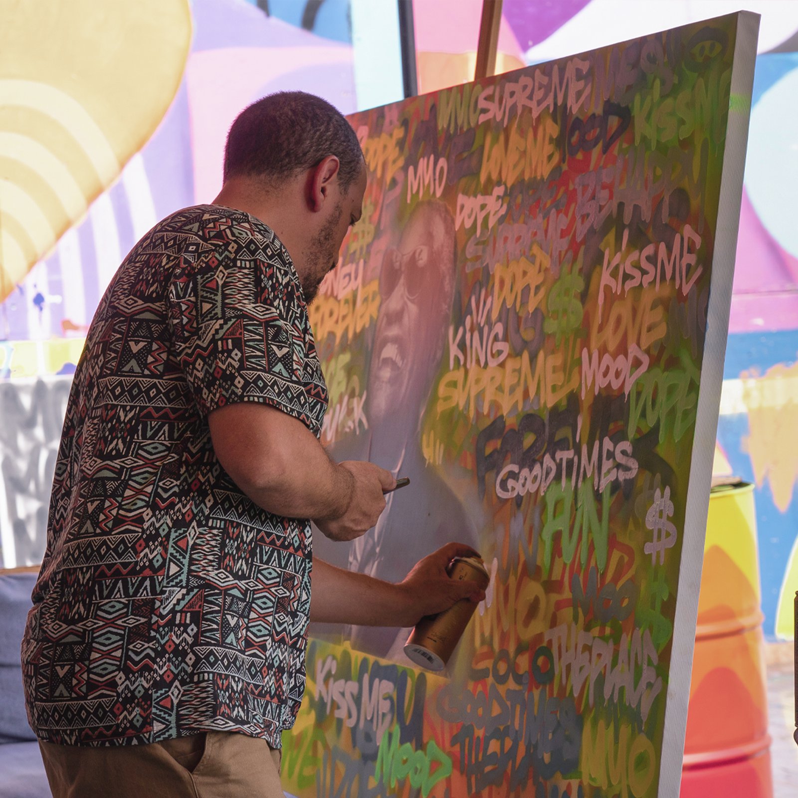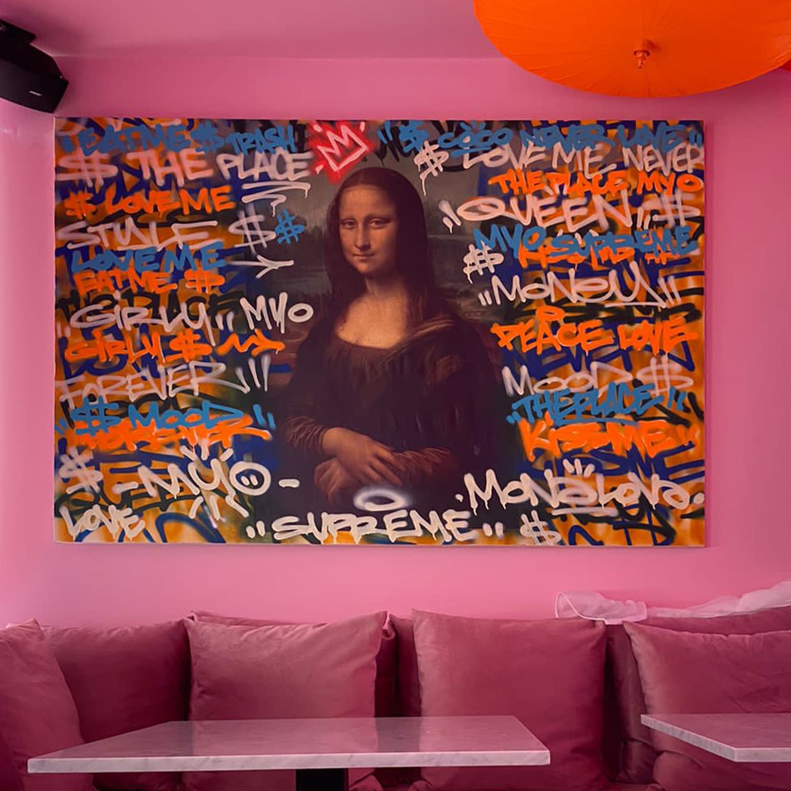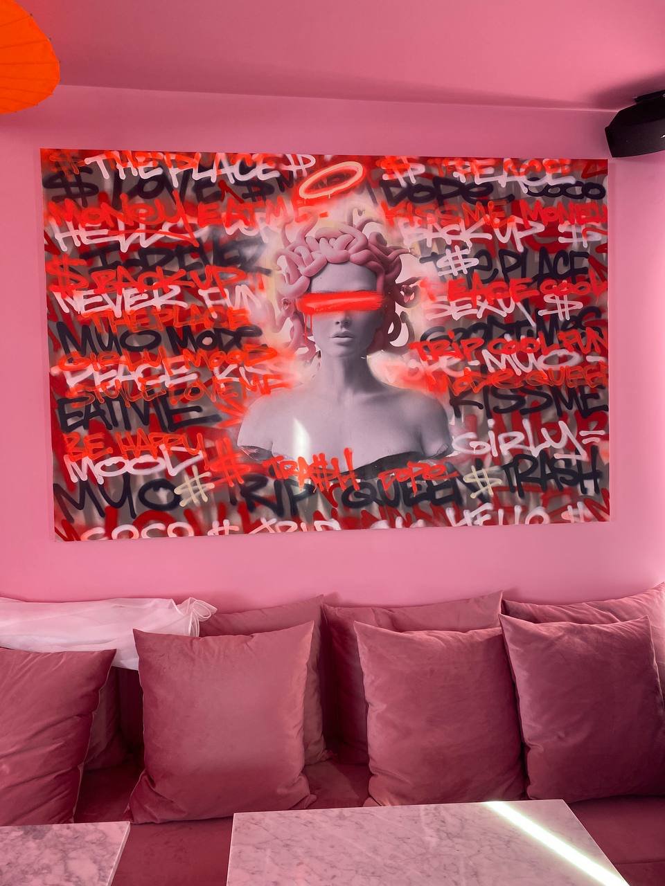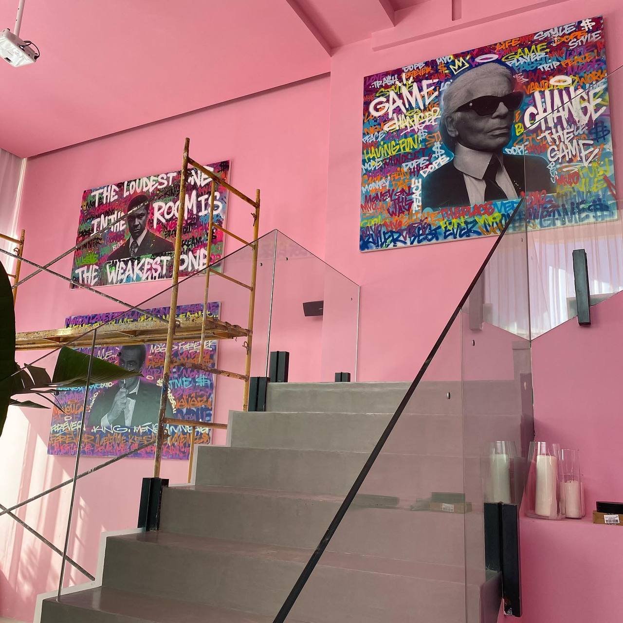 Ils voulaient qu’on réalise une dizaine de tableaux, chacun représentant une célébrité ou une figure iconique, entourée d’un univers graphique saturé de tags, de graffiti et de textures urbaines. Le tout avec une palette de couleurs fluos où le rose domine largement, mais où d’autres tons viennent dynamiser l’ensemble. Il fallait que ça claque, que ce soit vivant, percutant.