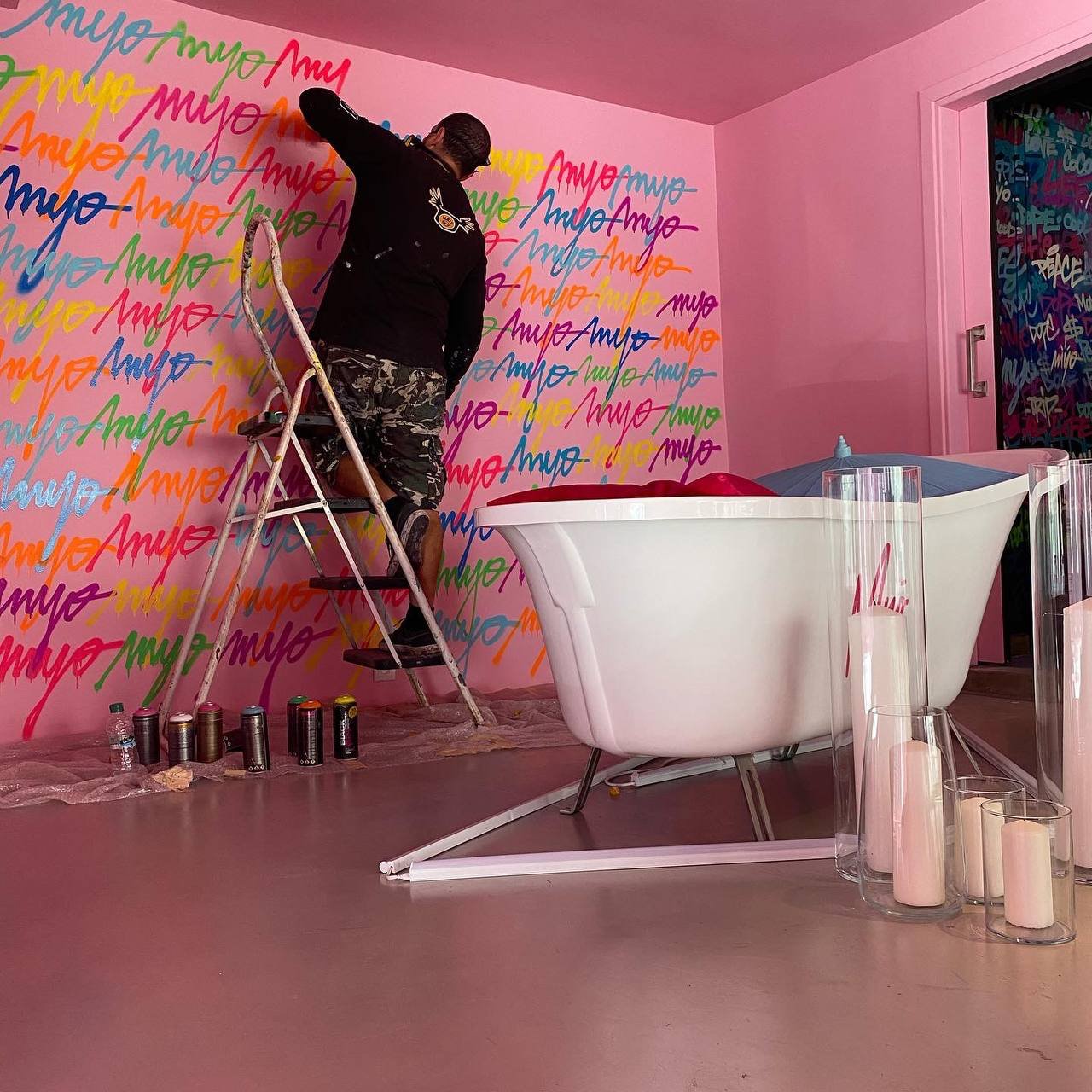 On a passé deux nuits blanches à fixer les tableaux, à ajuster certaines zones, à décorer les derniers murs. L’un des moments les plus funs du chantier, c’était la décoration des toilettes : on a transformé ces petits espaces en univers immersifs, avec des murs saturés de tags et un coin photo autour d’une baignoire rose culte, pensée pour les influenceurs.