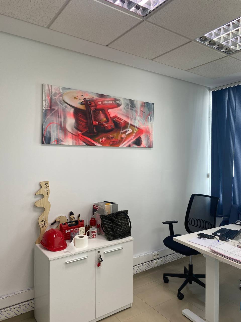 Après des semaines de travail en atelier, est venu le moment tant attendu : l’installation des œuvres dans les bureaux de Hilti. Et c’est là qu’une situation cocasse est survenue…
