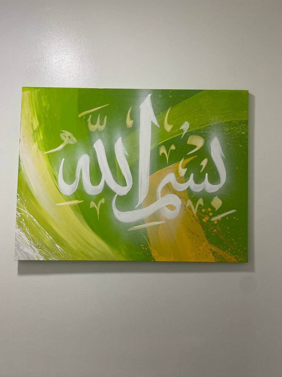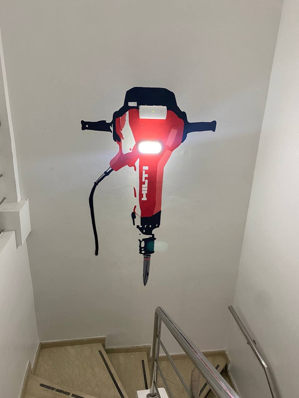 Lors de la fixation des tableaux, nous avons sorti notre matériel d’accrochage, dont une perceuse… qui n’était pas de la marque Hilti ! Un instant de gêne s’est installé… jusqu’à ce qu’Ilham intervienne avec humour :
