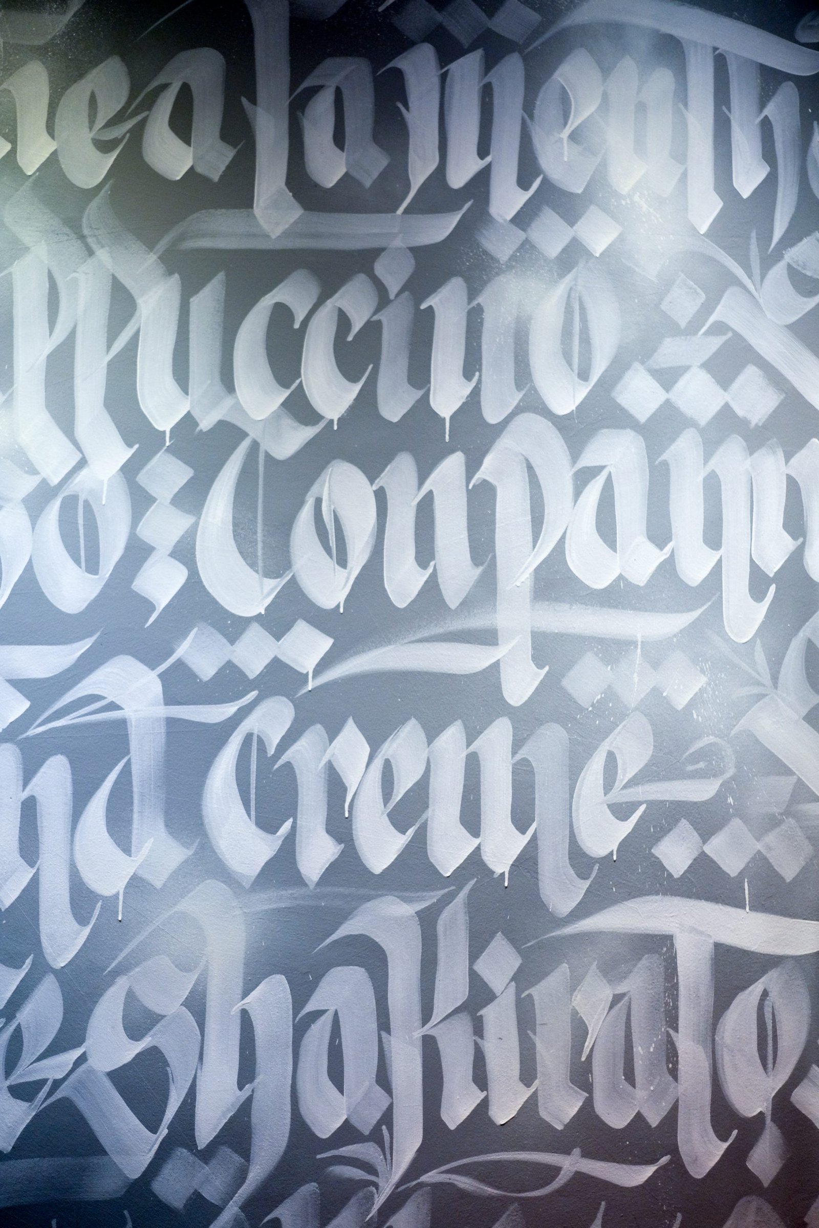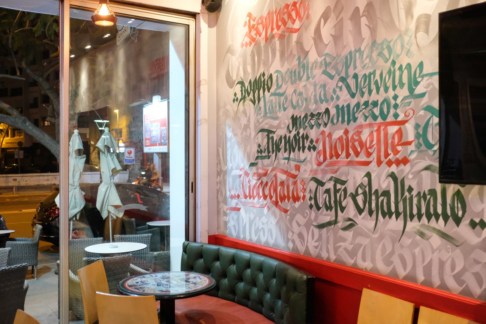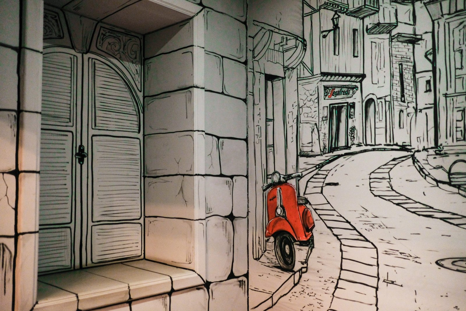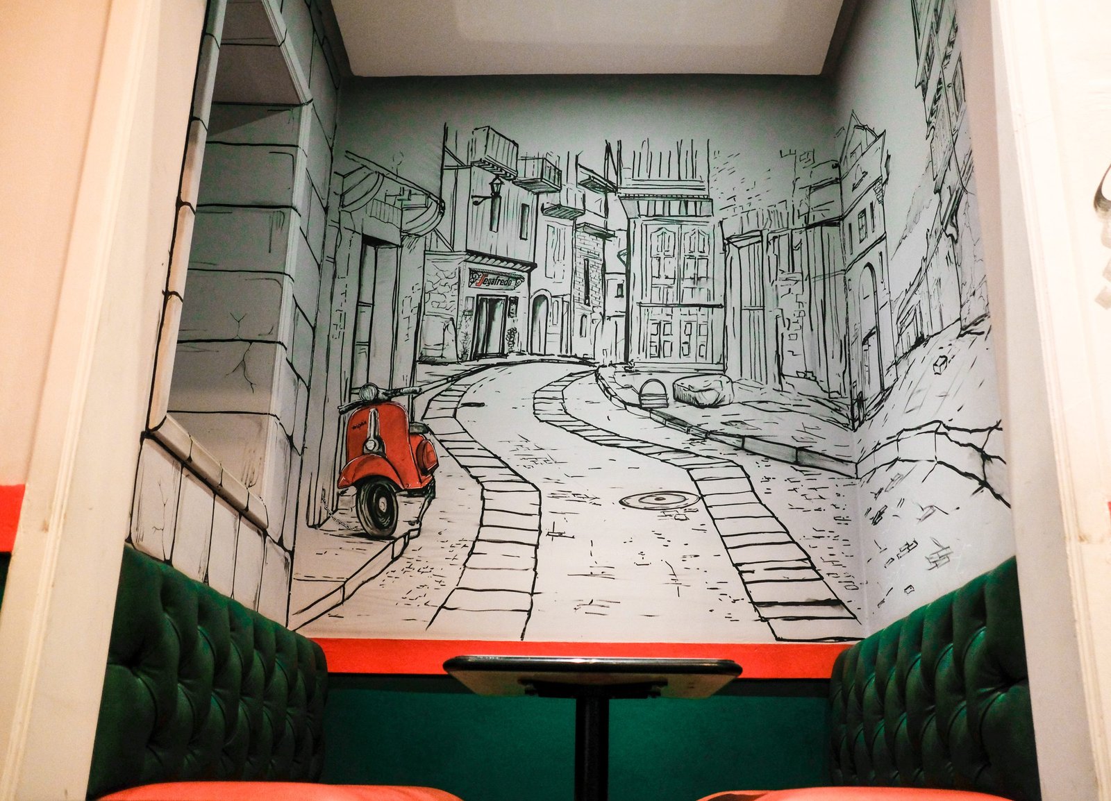 Le projet comprenait un mur de calligraphie, une illusion d’optique avec une Vespa, une fresque de village italien, une image vintage des années 60 et une tasse de café suspendue en plein vol.