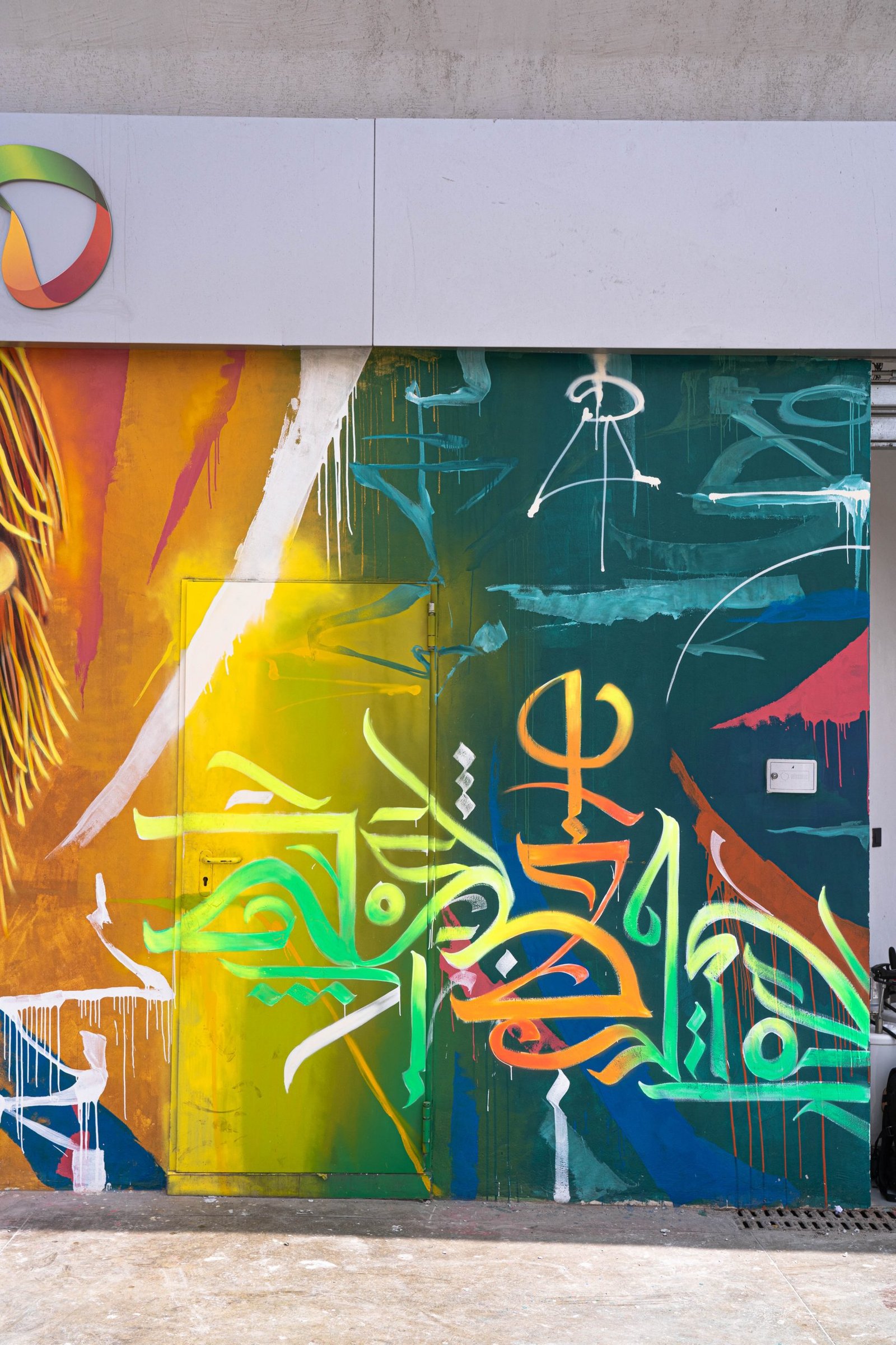 Sur un second mur, nous avons ajouté une calligraphie phosphorescente, mélangeant des écritures arabes traditionnelles et des motifs abstraits inspirés de civilisations anciennes.
