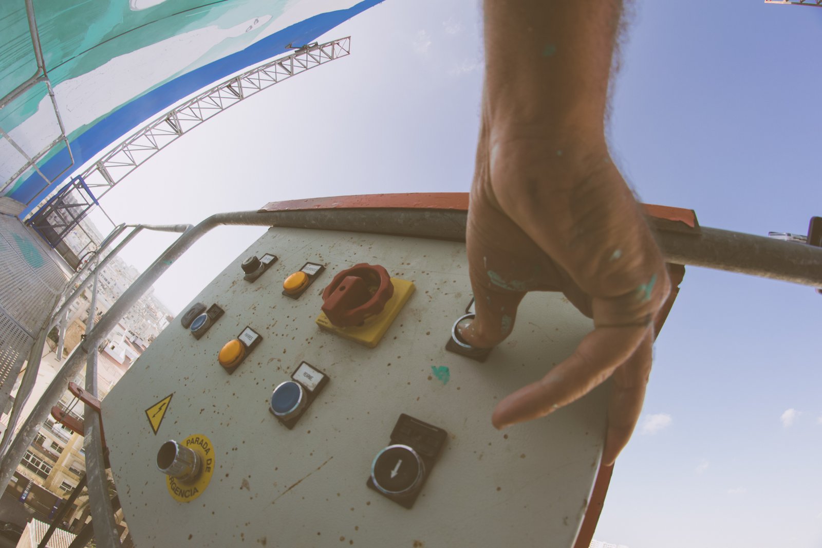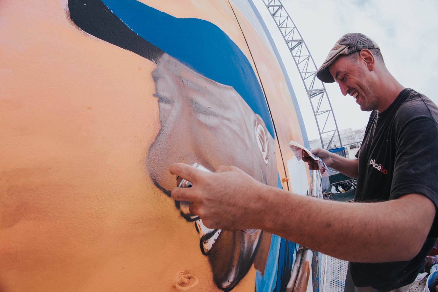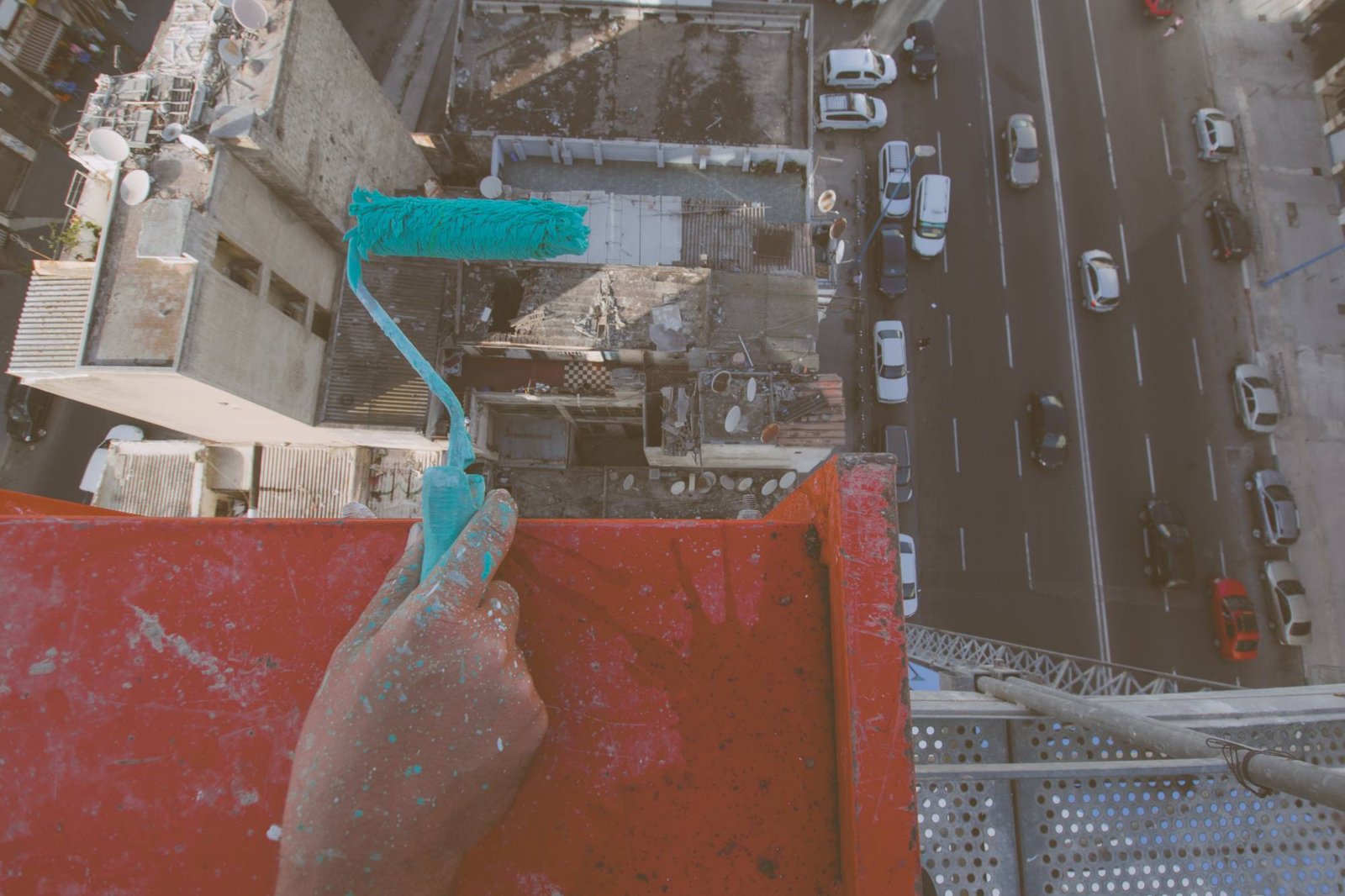 Techniquement, ce projet était un vrai casse-tête.Peindre en hauteur, c’est déjà un défi. Mais peindre sans recul, sur une nacelle suspendue, c’est une autre histoire. La nacelle utilisée n’était pas une nacelle standard : elle était fixée sur rails, contre le mur. Autrement dit, aucun recul possible pour juger des proportions. Un défi majeur quand on travaille à si grande échelle. Pour compenser, on a dû combiner plusieurs techniques : projection, pochoirs géants, traçage par transparence, encres spécifiques, poudres, etc. C’était un chantier hybride, où l’expérience de terrain a fait toute la différence.