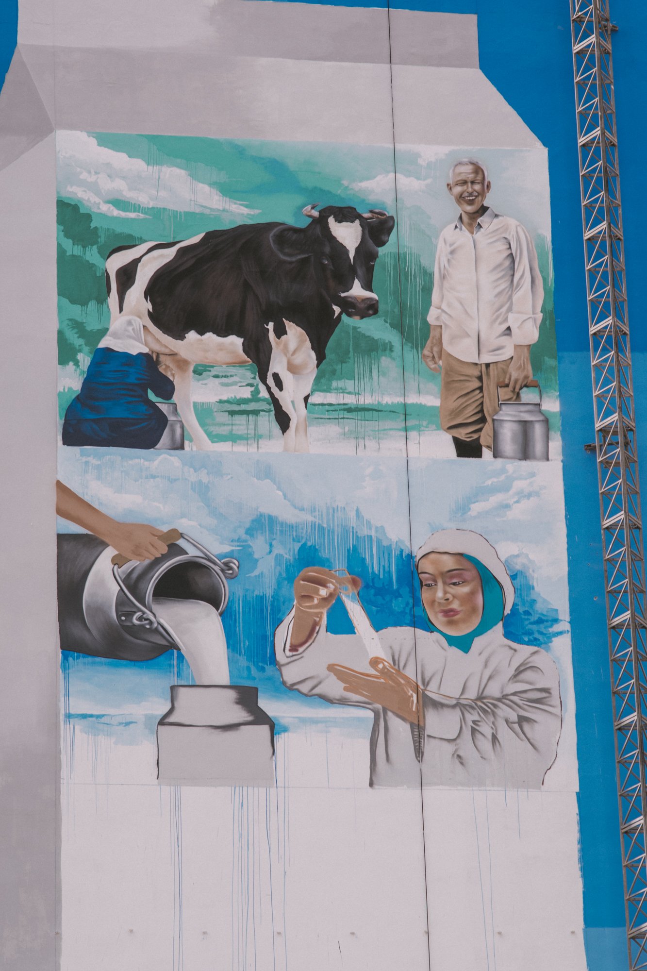 Tout part d’un spot publicitaire où l’on suit chaque étape de la chaîne du lait : de la vache à l’agriculteur, des laboratoires à la logistique, jusqu’aux épiceries de quartier. Danone voulait faire vivre visuellement cette histoire sur une façade géante, dans un lieu emblématique de Casablanca.