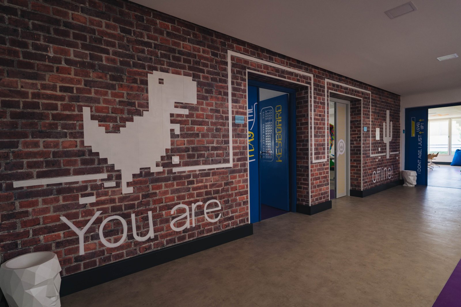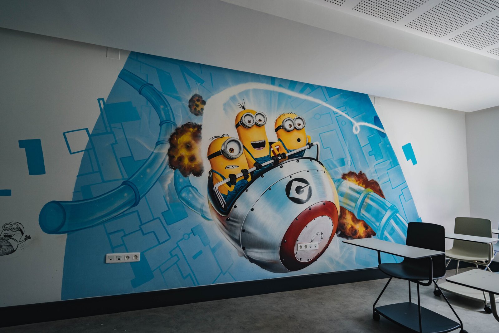 Plutôt que de peindre « des murs », notre équipe a conçu chaque zone comme une ambiance immersive unique. Des couloirs aux escaliers, en passant par les salles de classe et les espaces communs, tout a été scénographié pour inviter au rêve, à l’apprentissage et à l’évasion.