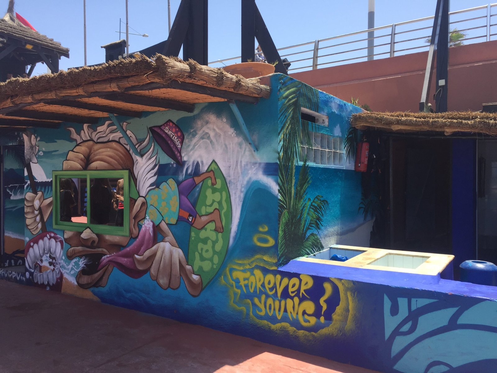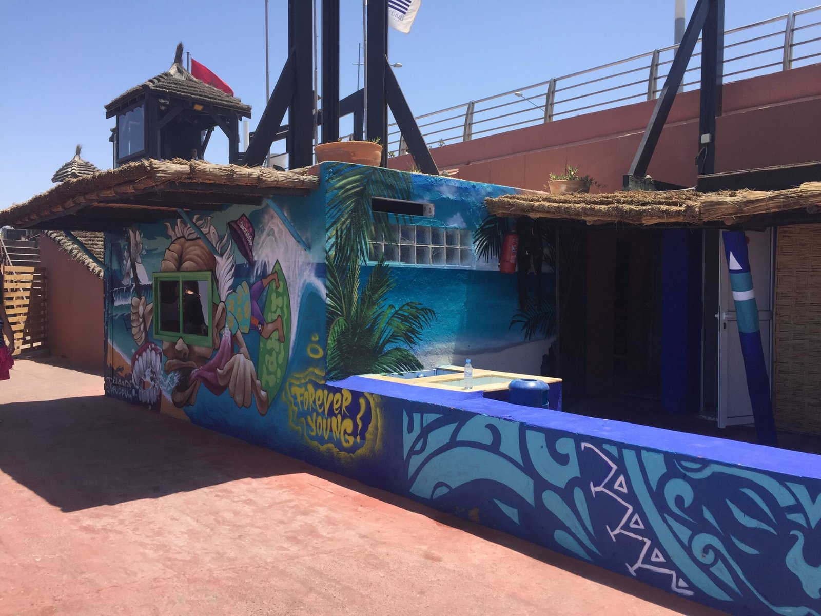 L’aventure Surfland ne s’est pas arrêtée à un seul mur. Quelques années après notre première collaboration, une nouvelle opportunité voit le jour : Tahiti Beach, lieu emblématique de la corniche de Casablanca, nous contacte pour créer une seconde fresque, cette fois dans son espace piscine, encore plus vaste, visible par tous les visiteurs du lieu. Ce projet prolonge naturellement l’histoire amorcée avec Surfland.